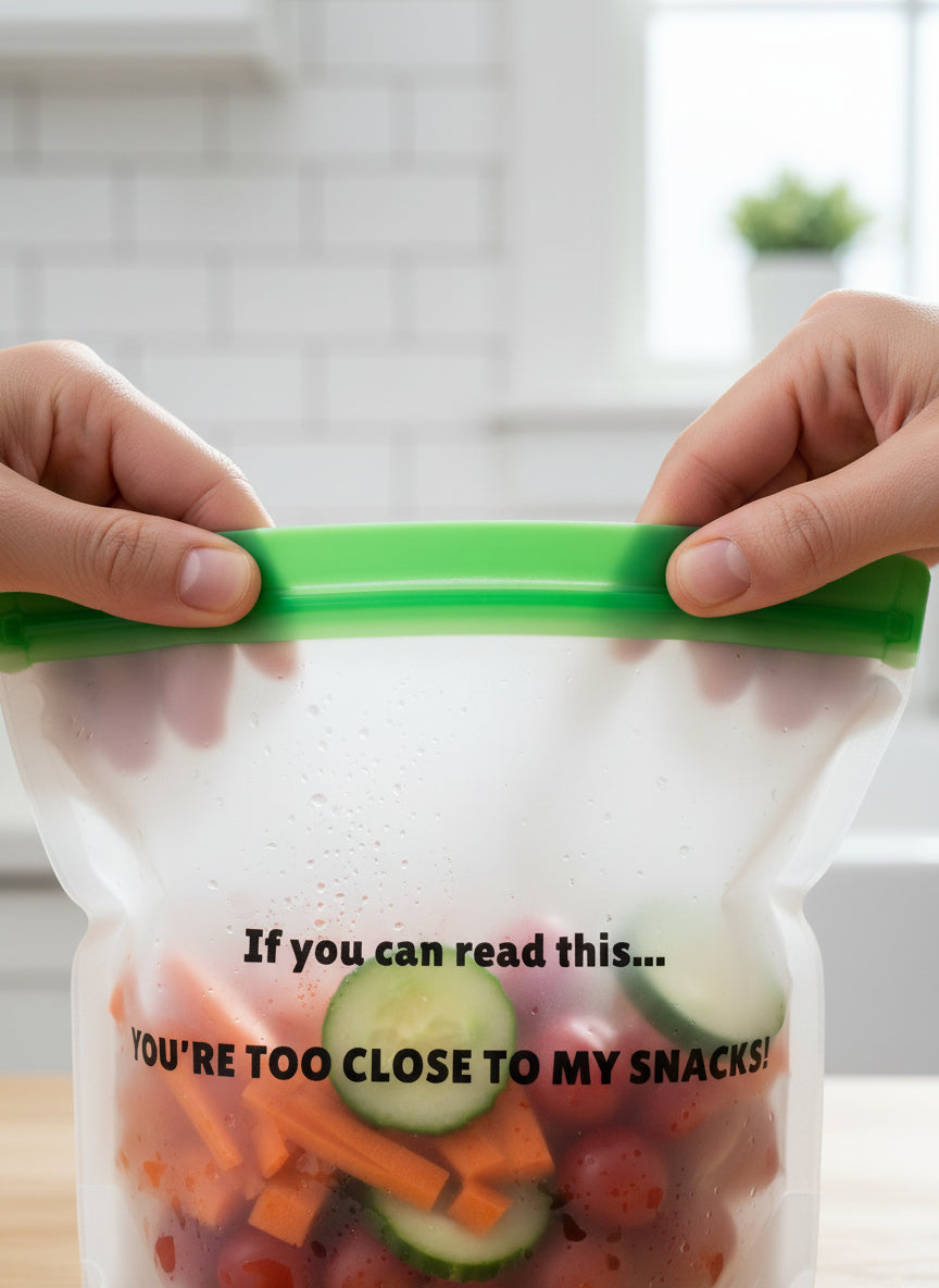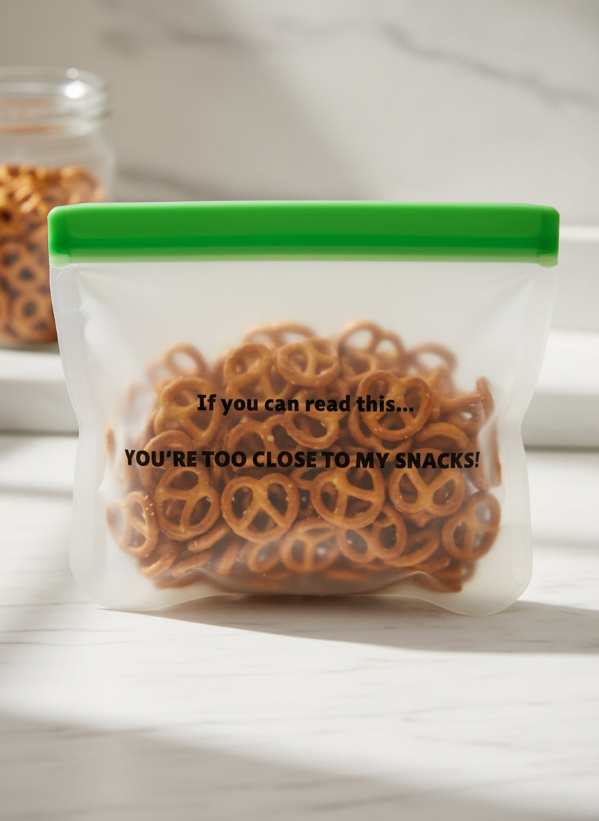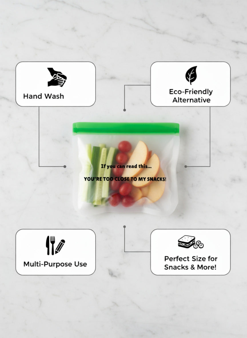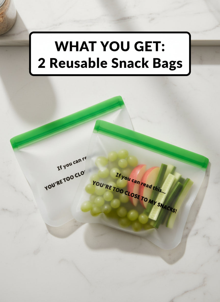 Say goodbye to boring, single-use plastic bags and hello to a whole new level of snack security and style! Our **Set of 2 Reusable Snack Bags** aren't just about reducing waste – they're about making a statement. Featuring the iconic, laugh-out-loud phrase, "If you can read this... YOU'RE TOO CLOSE TO MY SNACKS!", these bags are designed to bring a smile (and a clear boundary 😉) to anyone who dares eye your delicious treats. Perfect for adults, teens, and even older kids, they're the fun, sustainable choice for every snack lover.